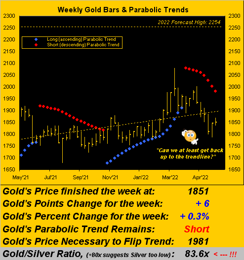 Thus we've next Gold's weekly bars from one year ago-to-date, the parabolic Short trend now nine weeks in duration and keeping the cover on price: