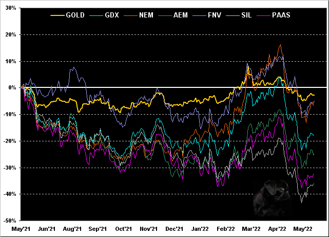 As well from this date a year ago through yesterday we've the percentage tracks of Gold along with those of several key precious metals equities. The U.S. money supply across these 12 months is +7.0%; but every entity in the following graphic is lower. Specifically, Gold itself is off the least at -3%, followed by Franco-Nevada (FNV) -5%, Newmont (NEM) -6%, the VanEck Vectors Gold Miners exchange-traded fund (GDX) -18%, Agnico Eagle Mines (AEM) -25%, Pan American Silver (PAAS) -32%, and the Global X Silver Miners exchange-traded fund (SIL) -36%. As they say in the South: "Iz'all dun gone to da dawgs...":