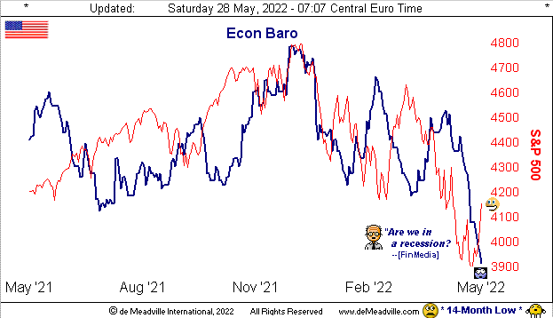 Speaking of dogs, as earlier stated, the Econ Baro -- amidst all the frothy stock market euphoria -- reached a 14-month low yesterday. ('Course, that isn't going to be on CNBS, Bloomy or Foxy, their not wanting you to change the channel). Here's the raw reality, apparently unbeknownst to the happy stock chaser: