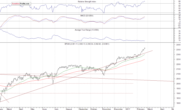 The main U.S. stock market indexes were virtually flat on Wednesday, following recent move up, as investors took some short-term profits off the table. The S&P 500 index remained close to its Tuesday's new record high of 2,366.71. The Dow Jones Industrial Average continued its uptrend, as it got closer to the level of 20,800, and the technology Nasdaq Composite index remained close to 5,900 mark. All three major indexes trade along their record highs. Will the market extend its year-long medium-term uptrend even further before some more meaningful downward correction? The nearest important level of support of the S&P 500 index is at around 2,350-2,355, marked by Tuesday's daily gap up of 2,351.16-2,354.91. The next level of support of the S&P 500 index is at around 2,320, marked by last Monday's daily gap up of 2,319.23-2,321.42. The support level is also at around 2,300-2,310, marked by previous level of resistance and previous daily gap up of 2,311.08-2,311.10. We can see some short-term volatility following three-month-long rally off last year's November low at around 2,100. Is this a topping pattern before downward reversal? The uptrend accelerates, and it looks like a blow-off top pattern accompanied by some buying frenzy. The S&P 500 index trades above its medium-term upward trend line, as we can see on the daily chart: