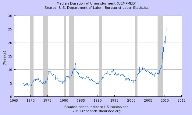 Sure, they can even fudge unemployment figures by re-defining what constitutes "unemployed" but they cannot hide the fact that the median duration of unemployment for those still getting past the definition hurdle is now 26 weeks or twice the rate of any year since 1965. If you don't believe me here is the graph.