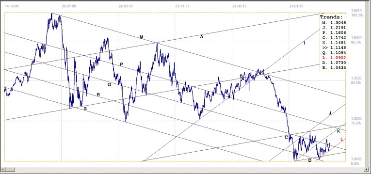 The last gasp dollar rally (?) of some weeks ago had the euro struggling to remain hold key support at the bottom of channel KL now at $1.0902. The support id hold, and the euro started its own rally in response, again breaking cleanly through the resistance at line Q ($1.1094), to present a more positive picture. Given the degree of volatility and turbulence that came with 2016, anything can still happen.
