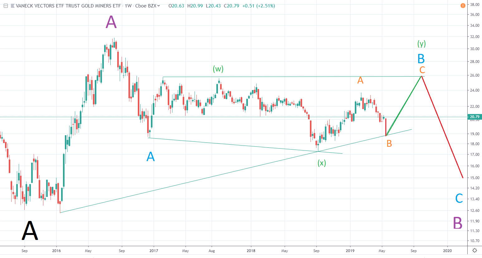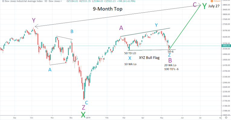 Below, I have my preferred count (on shaky ground as I mentioned) and that is Wave B of “Y” terminated May 13th and it rallies hard into early July. Early July is 9 months (39/40 week cycle) from the October 2018 top. The recent irregular top on the SPX on May 1 has me concerned that I could be wrong as wave ‘z’ would have counted out –xyz- itself, which is not likely with this kind of formation. It could be xyz “x” May 13th and then “y” into May 21 with “z” of Z into June 5th.