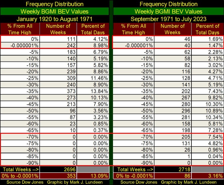 Below are two Freq Tables for the BGMI, one for the data before August 1971, the other after. I placed a red box around the 0% & -0.000001% rows, with new all-time highs recorded in the 0% row, and weekly closes in scoring position (-0.01% to -4.99%) in the -0.000001% row. In bull markets, rising market valuations increases the counts in these rows.