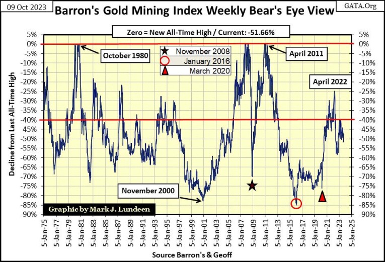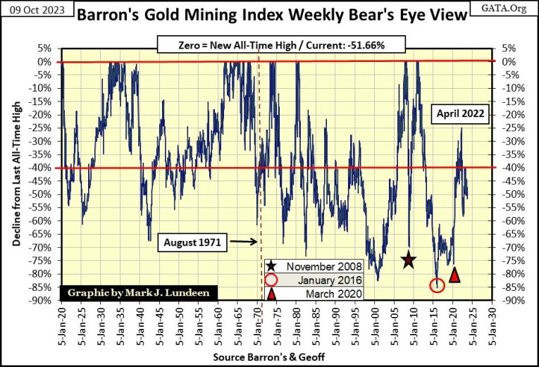The “policy makers” are making life difficult for the gold and silver miners, as they have for a very long time. Below is a Bear’s Eye View (BEV) of Barron’s Gold Mining Index (BGMI), going back to 1920; 103 years of data. Barron’s began publishing their gold-mining average in early 1938, when they began their Barron’s Stock Averages data series (BSA), published until October 1988 when they discontinued this weekly series. The only data series from the BSA Barron’s chose to continue publishing was their gold-mining average, rebranded as the BGMI. That is interesting to know.