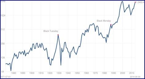 If you want some real long term perspective on the US market you can find it on the chart below. This 134 (and counting) year chart shows the price level of the S&P in real (inflation adjusted) terms using constant 2014 dollars.