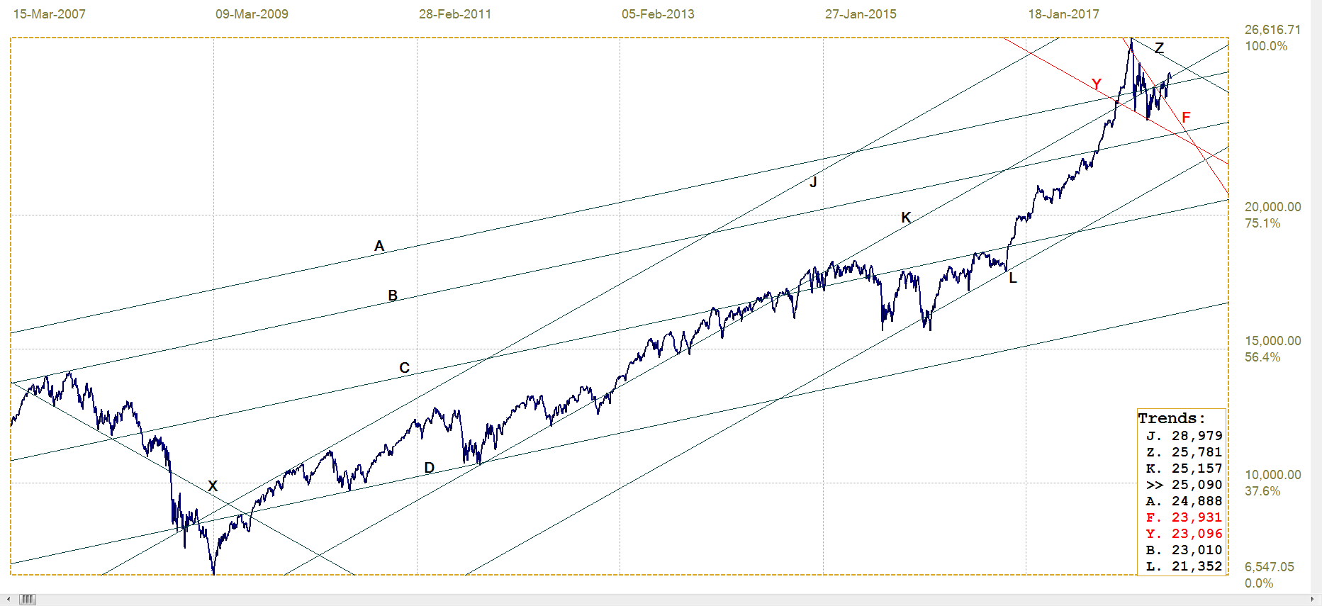 Last week there was a break above line K (25 157) which was behaving much like a watershed trend line; a line that passes through the chart with only one or very few penetrations of the chart itself. Watershed line typically act as strong resistance and support when approached from either direction and the break higher reported last week was seen as an indication the bull trend would resume.