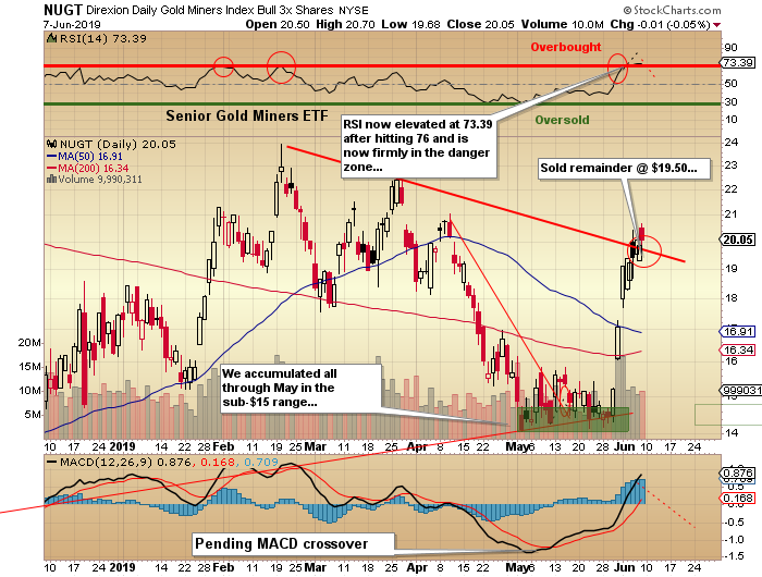 Gold miner ETF’s (NUGT/JNUG) were both wildly overbought by last Friday and while I was in awe of the impact of the buying, I added to the DUST and GLD July $125 put positions late week (confirmed by multiple tweets when action was taken) and now remain comfortably short with gold down $15 going into the Monday opening.