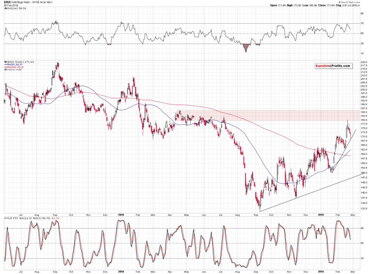As always, there are no sure bets in any market, but it does appear likely based on the above chart alone. We see the sell signal from the daily Stochastic indicator, but we saw it also many times in the previous weeks, including the mid-February case, and miners moved higher nonetheless. Consequently, it doesn’t seem that the daily version of this indicator alone can really be trusted. Naturally, this doesn’t change the very important and bearish medium-term implications of the weekly Stochastics.