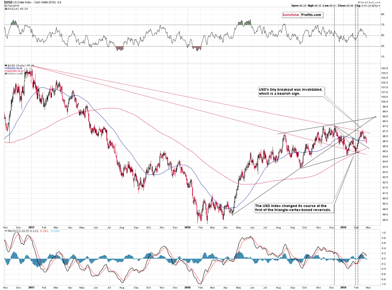 We have just shown you why it wouldn't be wise to take yesterday's show of strength in the miners at face value. The important distinction between their situation today and a similar one from the middle of February is the state of the USD Index. The USD Index remains in a medium-term uptrend while its short-term examination shows that it may actually reverse higher pretty soon. It seems that the precious metals market doesn't really want to move higher in earnest and is instead waiting for USD-induced cues as a catalyst for its next move. That is, for its medium-term decline resumption.