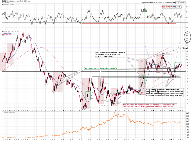 The USD Index is in a medium-term rally and the last couple of months have been a corrective stage of the move. Such corrections are normal in any bigger upswing, and their shape can tell us something about the strength thereof. The fact that the USDX moved higher on average even though it moved sideways from the short-term point of view (forming higher lows and higher highs), attests to the strength of the bulls. Please note that even the Fed’s recent dovish comments didn’t trigger any sizable move lower.