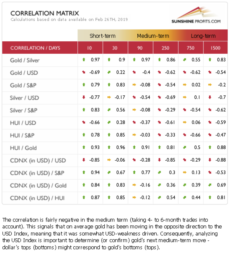 We would like to build on this contribution and provide our perspective. We’ll start by sharing a peek into our in-house developed, proprietary CORRELATION MIX. Let’s take a look at several timeframes that explore the gold-USD link as it stands on Feb 27th, 2019: