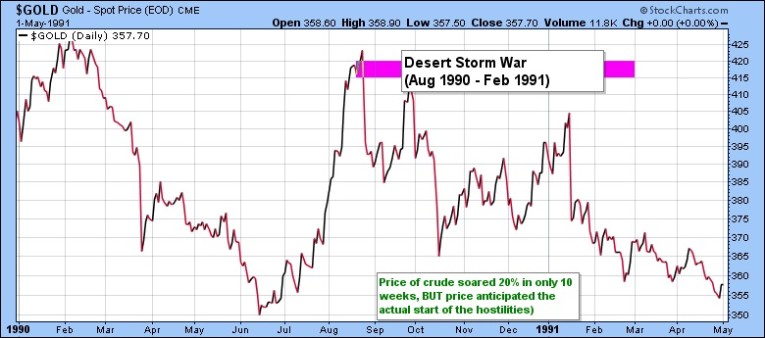 Geo-political conflict and saber rattling threats in the Middle-East began and accelerated in early 1990. Consequently, commodity prices began moving before the first shot was fired. Specifically, the price of gold anticipated the beginning of the Desert Storm War by soaring nearly 21% in the tense period leading up to the actual start of hostilities. The shiny yellow rose for $350 to $423/oz in only 8 weeks leading up to the war in August 1990. However, once the war broke out, gold promptly dropped -14% as hostilities waged. Perhaps speculators expected a short war, and consequently took profits.