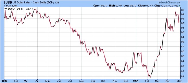 Surprisingly, the Desert Storm War had a negative impact on the US$ Index -- as it anomalously fell -12% from 93 to 82 during the period. But once the hostilities ended in February 1991, the US greenback roared upward by +17% in only 8 weeks.