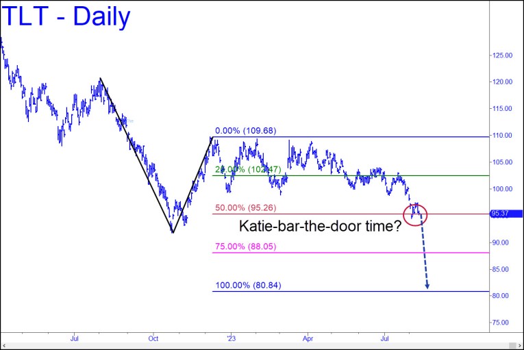 In technical terms, TLT, an ETF proxy for T-Bonds maturing in 20+ years, is on thin ice. It tested a key support two weeks ago when it came down to the red line, a ‘midpoint Hidden Pivot support’ that must hold if TLT is to avoid a further fall to the 80.84 target. Although the line has yet to be penetrated decisively, it looks to be giving way. A two-day close beneath it would likely send TLT down to at least 88.05, a last-ditch support. Beneath it lies an abyss that portends a rise in long-term rates to at least 5.5% (as noted here earlier) from a current 4.27%. If there is a bright side to this scenario, it lies in the implication that an all-but-certain debt deflation much more destructive than any consumer inflation we are likely to experience is going to be yet a while longer in coming.