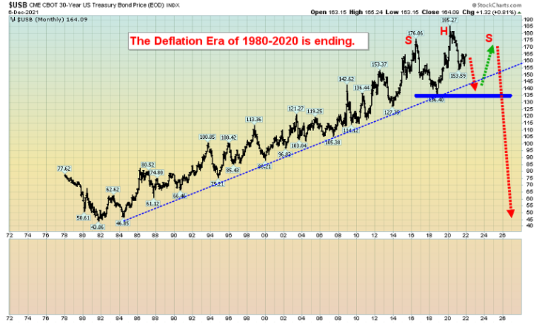 The long-term T-bond chart. A huge top pattern is likely forming, but an inflation-related meltdown is likely still 4-5 years away.