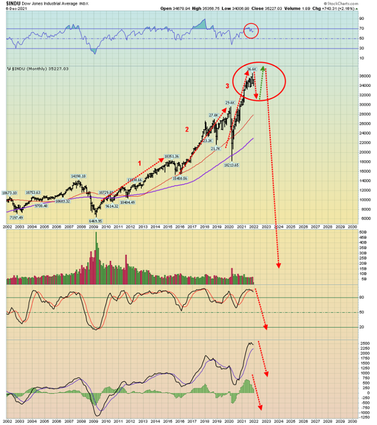 The Fed is potentially entering an inflation-oriented tightening cycle and the Dow is overbought. Note how far above the 60month moving average the Dow is, with the MACD indicator rolling over ominously.