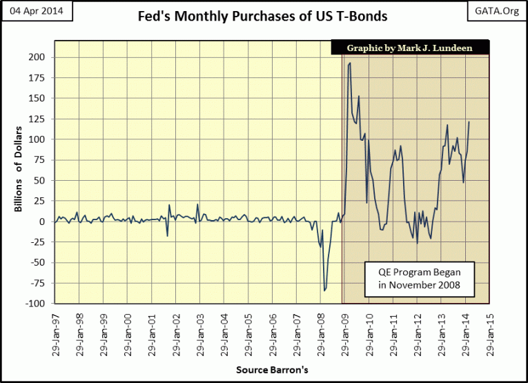 QE-3 began in September 2012 with the Federal Reserve committing itself to the purchase of $85 billion dollars a month of US Treasury bonds and illiquid mortgages from its favorite financial institutions – the big NY banks.  And why not?  They own the Federal Reserve.  In December the Fed announced they were going to reduce their QE by $10 billion in January, and then announced they would taper QE by $10 billion in February and another $10 billion in March.  No doubt they will be “tapering” QE by another $10 billion in April as they have also said that they want to be out of the QE business by autumn of this year.