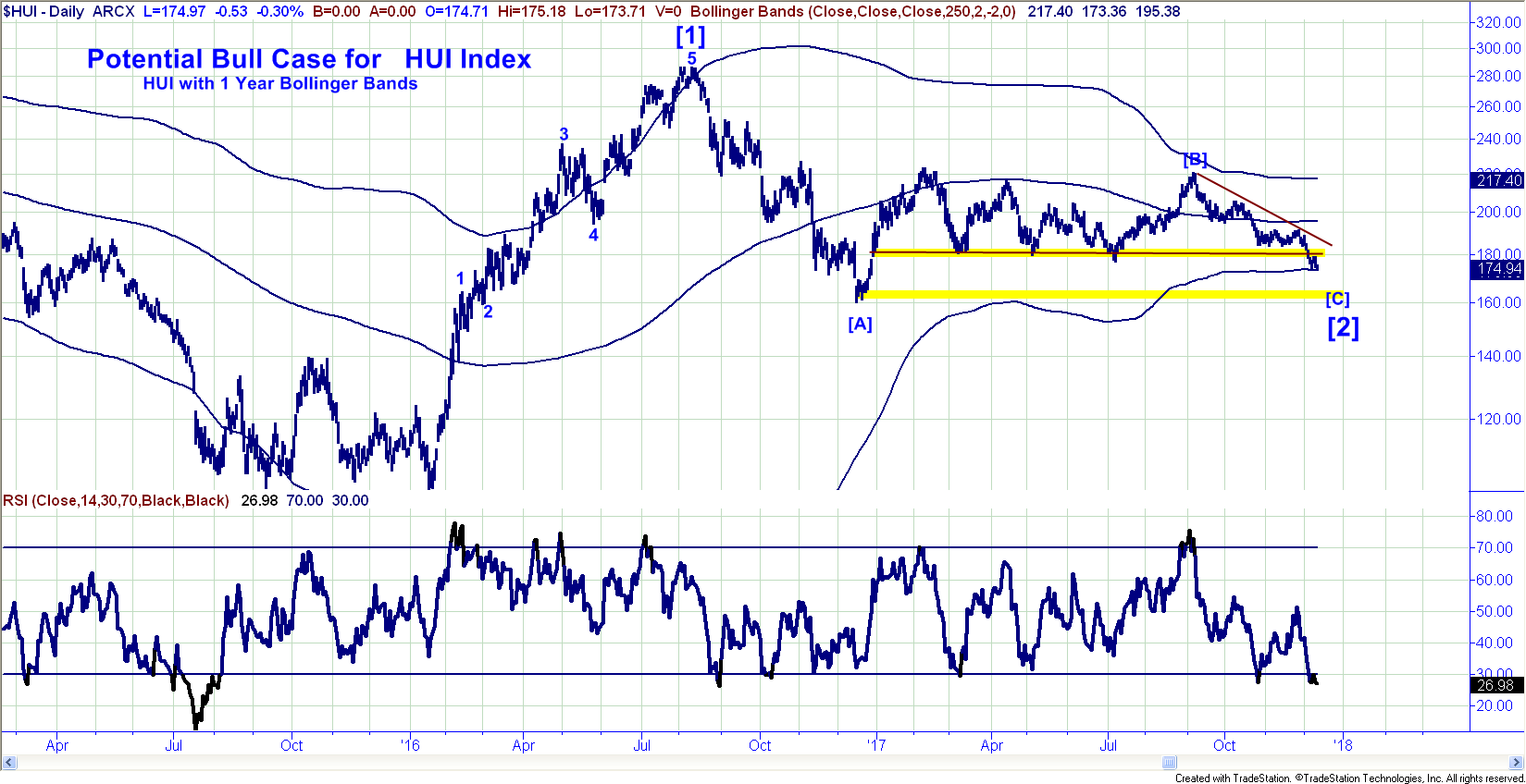Perhaps the best evidence we can find that this area could become an important bottom is the presence of the one year Bollinger Band where both XAU and HUI (but not GDX yet) have come down to tag that band. Generally speaking, that lower band can be a very powerful shelf of support and so if prices can hold at these levels for a few days or even rally a bit it, it could be the first sign that a bottom has been seen. On the HUI, we think resistance on a rally will come in at 182 and that if prices are going to make a stand the 173.00 area needs to hold over the next three to five days.