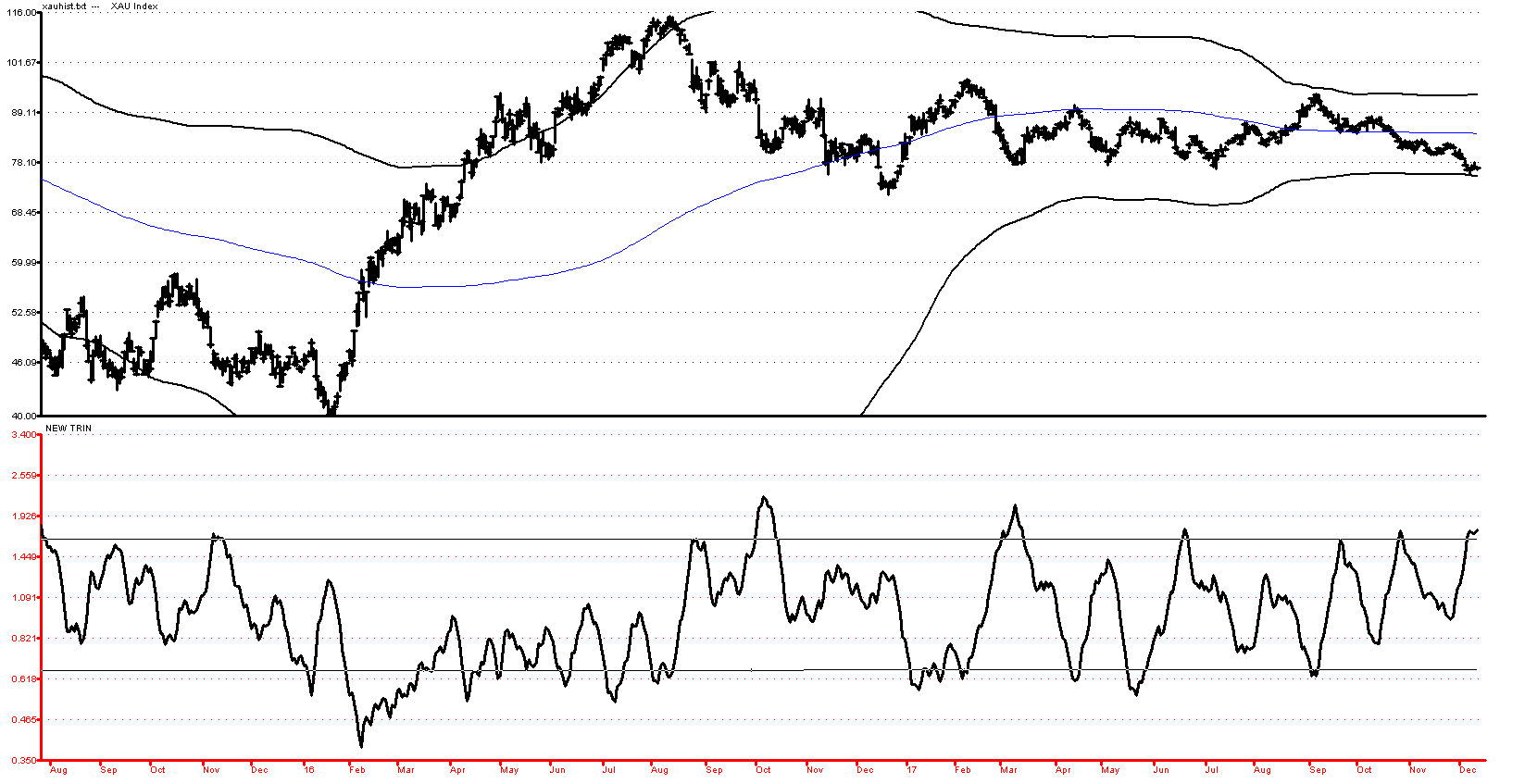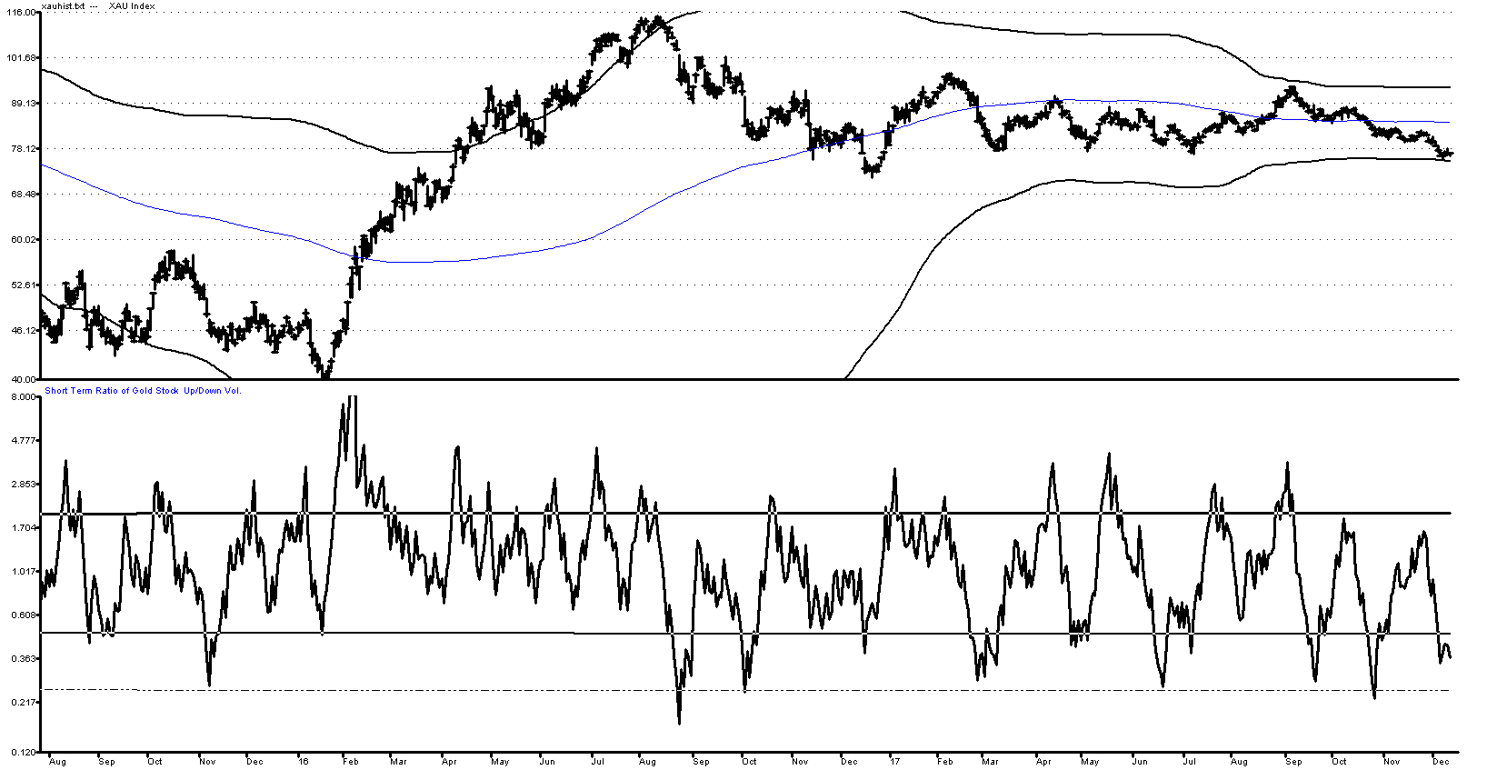 On the technical front, short term indicators like the McClellan Oscillator and the Up-to-Down Volume Ratio for gold stocks (above) are reasonably oversold with the Up to Down Volume Ratio at a reading of .36 as of Tuesday Dec 12th close. While it can still go lower, normally, if there is going to be a downside extension in prices we would see that break over the next one to three days and this gauge would move down to very dramatic oversold levels, the .25 area shown in the lower dashed line. That would then take more time to build a base. So we should know a good deal more over the next few days as to to whether gold Stocks and gold will make a stand at these levels or extend to the downside one more time.