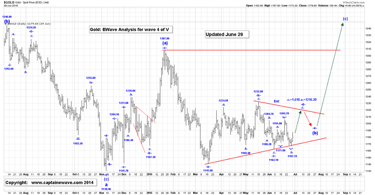 It appears that wave .b. of our wave -d- triangle is not complete at the 1168.10 low, as we had previously suggested so we are now expecting another visit to that low.