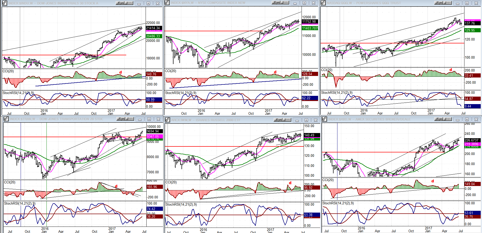 There is no real weakness showing in any of the charts below. Instead, we had what was the weakest index becoming the strongest on a near-term basis. The TRAN (bottom left) had been a laggard until some buying started on 6/26 and pushed it to an all-time high by Friday’s close. It is also clear that the DJIA (top center) is still strong. It made a new high a week ago and, with Friday’s positive action, it looks as if it is preparing to make a newer one.