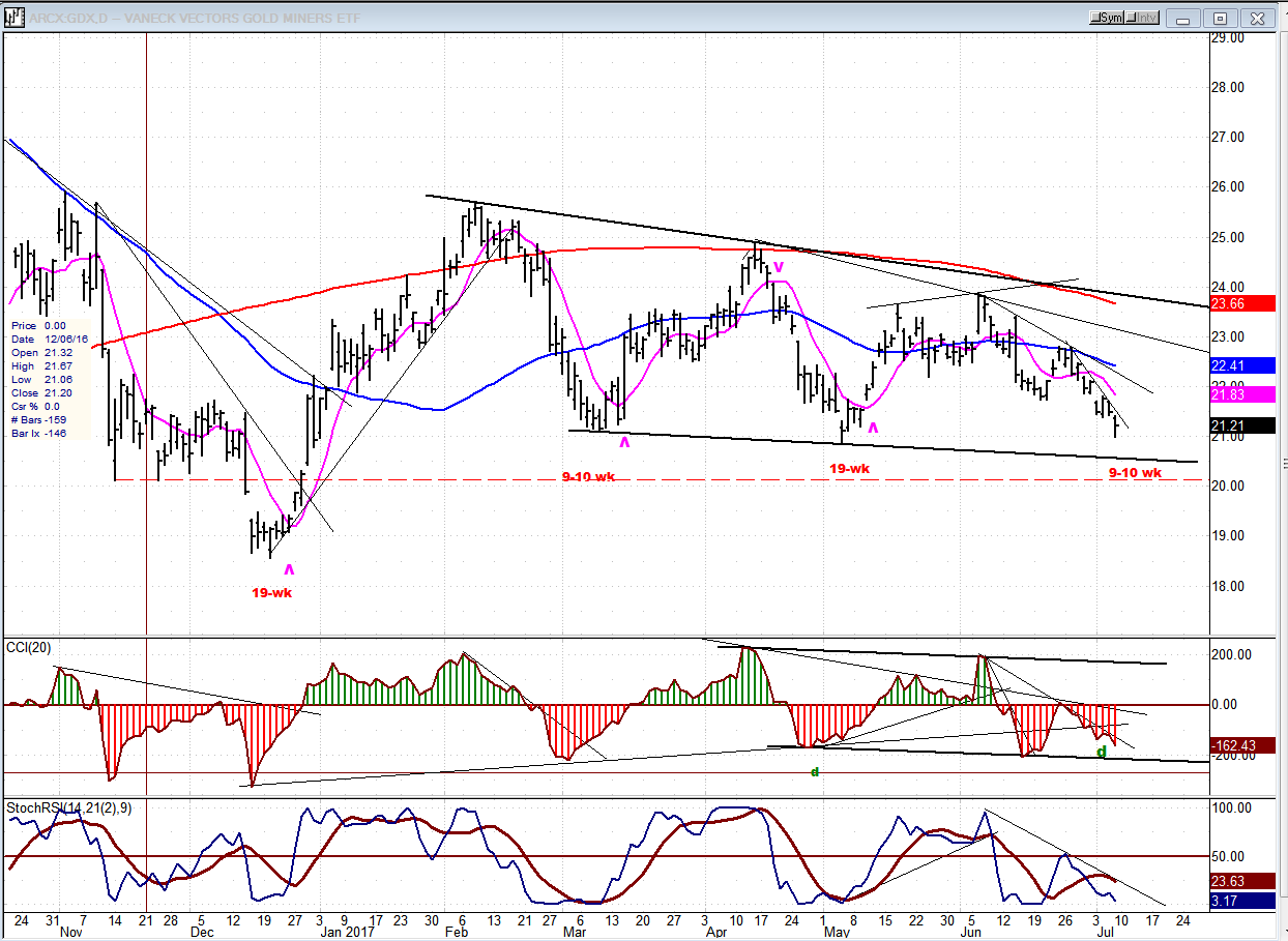 GDX should continue to consolidate until it reverses after the intermediate cycle makes its low. This could be at any time during the coming week. One negative result of the price action is that what could have been a short-term base turned out to be distribution instead, and GDX may have to continue its correction to satisfy the projection requirement. Another aspect of this is that the price action has created overhead resistance starting at 22.50, and this could limit the extent of the recovery after the cycle has bottomed.