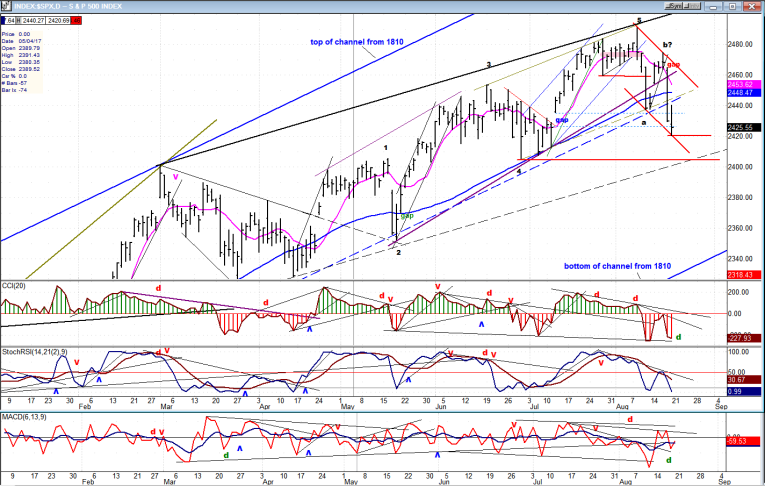 One could argue that we will not have absolute confirmation that an intermediate downtrend has started until we drop below 2405, and that would be reasonable. That level could, in fact, hold the decline in check for a few weeks, as volatility continues to be the dominant pattern. However, the odds that the index will eventually retrace to much lower prices by October is still on the front burner.