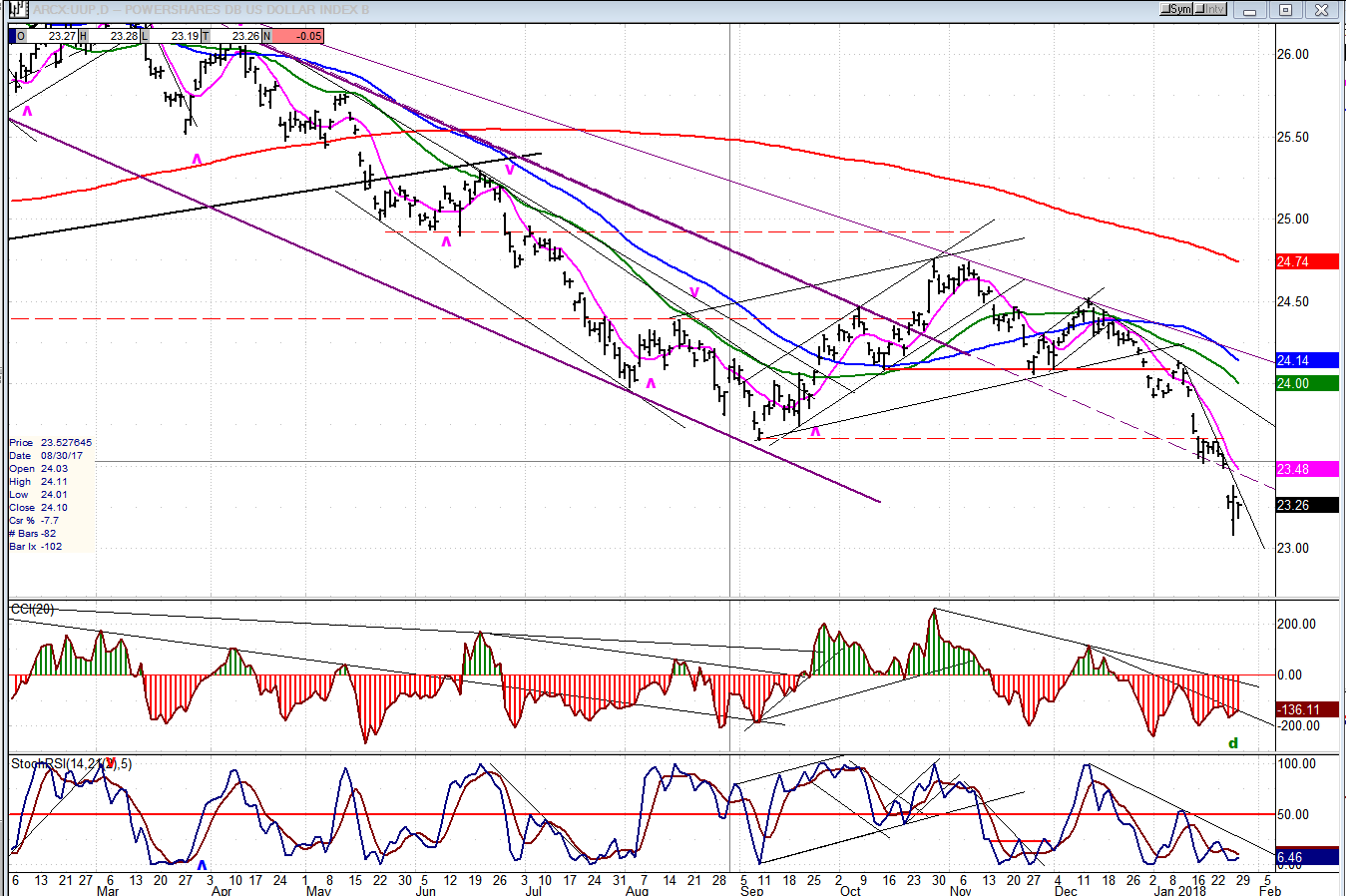Last week, UUP was buffeted by comments from the treasury secretary -- who prefers a weak dollar -- and the president -- who now likes a strong dollar. The net result was that the dollar ended significantly lower probably on its way to eventually re-test the 2011 low.
