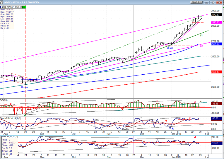 I have seriously underestimated the extent of the uptrend which started with the low of the 7-year cycle at 1810. I was looking for a phase count to take us to a 2660 top, but that turned out to be a short-term stop with SPX only pausing briefly at the end of 2017 and, re-invigorated by the tax bill, it shot up another 200 points in less than a month. An eventual move to the low 3000s had been anticipated and posted under “Long-term trend”, (above), but I did not expect it to be approximated this quickly. In spite of its near exponential trajectory, SPX appears to be building the normal staircase pattern to its next significant projection target. This means that driven by minor cycles, the index forms a re-accumulation pattern which gives us a good idea of what level will be reached at the next minor cycle high, and this process is repeated until it nears the next important price projection, begins to break uptrend lines and eventually reverses its trend.