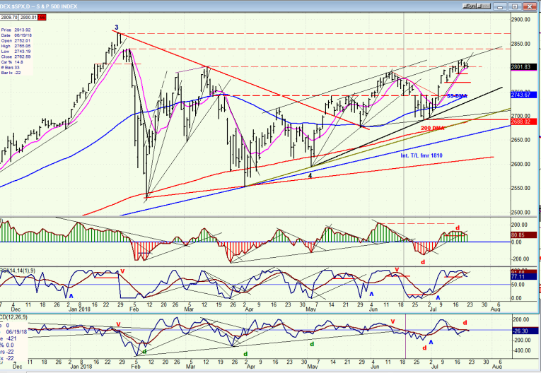 Last week, SPX reached its ~2800 P&F target and started to form a short-term top. By Friday, the hourly indicators had given a sell signal and the daily had continued to increase their negative divergence pattern, suggesting that a short-term correction was imminent. This is expected to be a normal pull-back following the previous move which started at 2692 and ended at 2815, and we can’t be too far off if we apply our standard measurement of a .382 to .50 retracement of the just completed 123-point uptrend to determine the extent of the correction. This would bring the index back down to between 2750 and 2770 before the next short-term uptrend can get under way as the bullish progression continues toward an eventual goal of about 3000 or slightly higher.