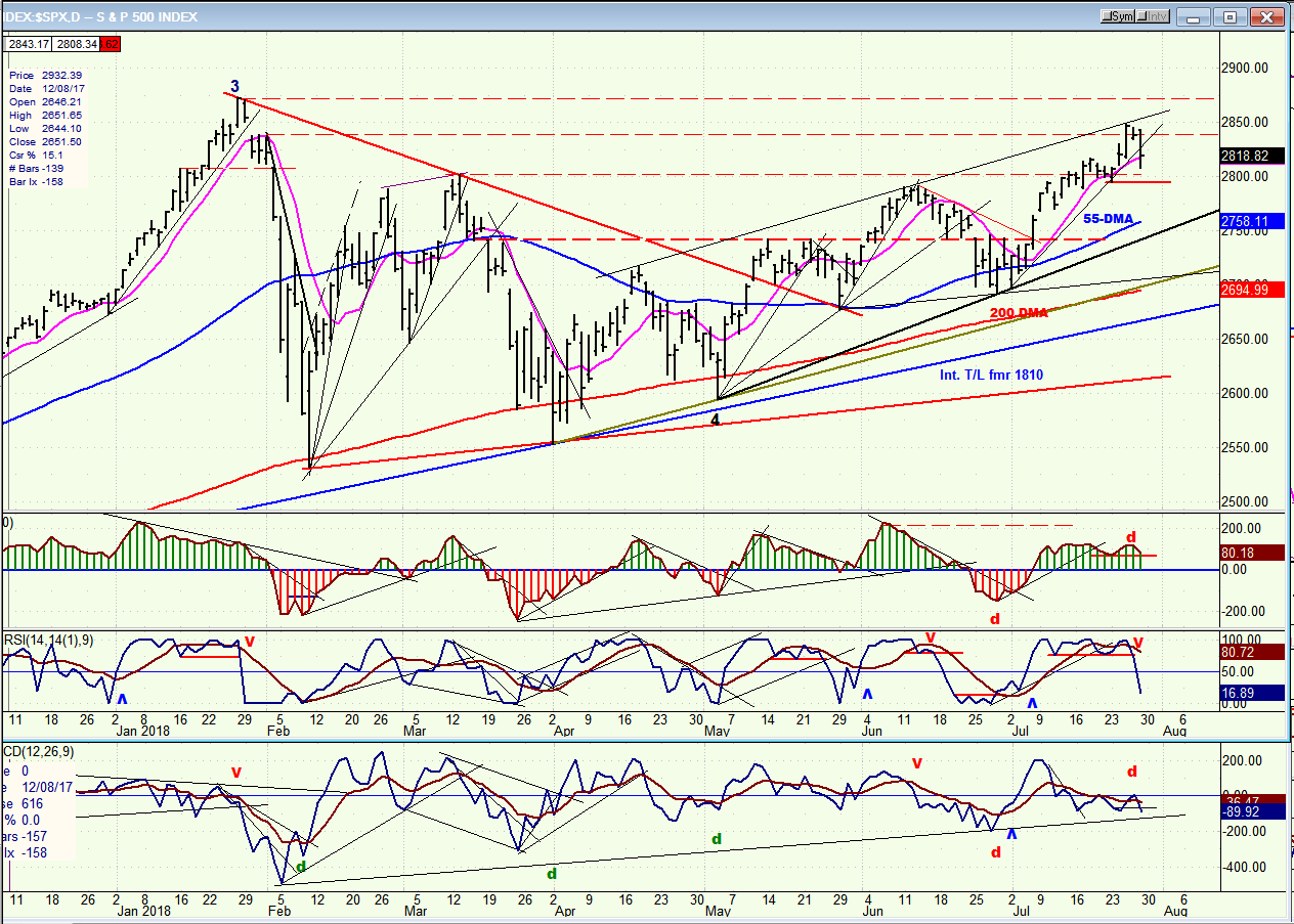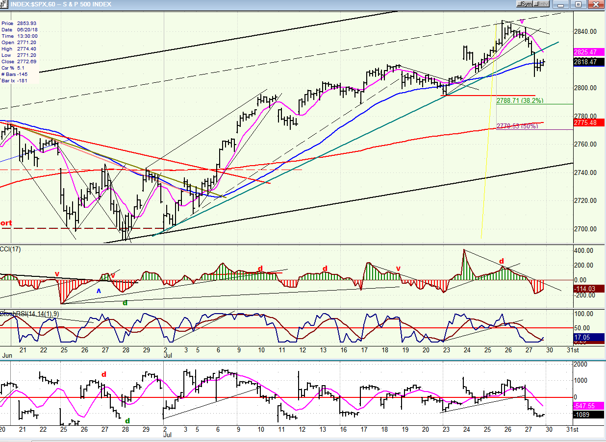 This past Wednesday, SPX approached the top of its channel and met with resistance. This stopped the advance, and a congestion pattern started to form continuing into the next day. By Friday, it became clear that this was distribution, and the minor cycle due to make its low that day started a pull-back which accelerated after it broke below the 2830 support and the short-term uptrend line from 2691.