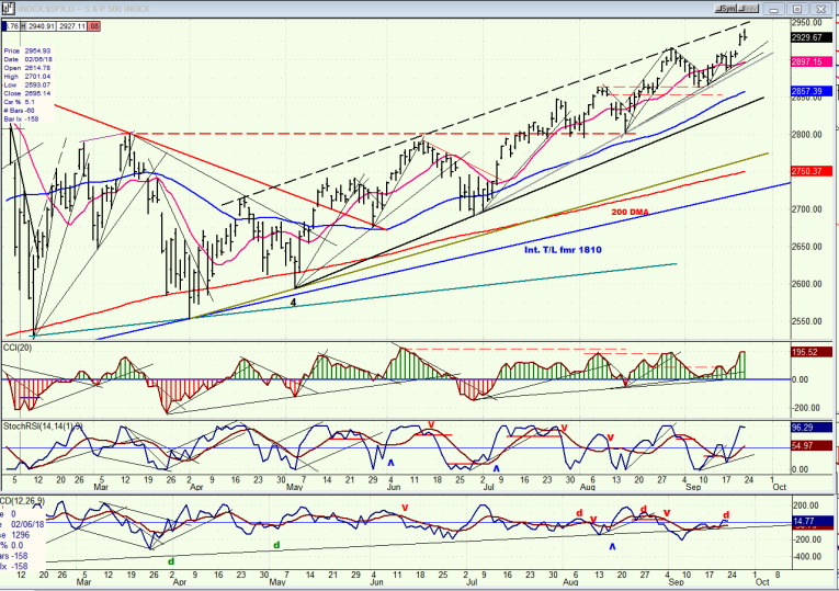 If we do make a new high to about 2950+ before ending this rally, and if we are going to retrace into mid-October, we should, at a minimum, test the blue trend line from 2700 and probably break through it slightly in preparation for what could be the final uptrend of the bull market. The lack of participation by NDX and especially IWM will become increasingly worrisome concerning the health of the bull trend if it turns out that they are currently in the process of making their long-term highs.