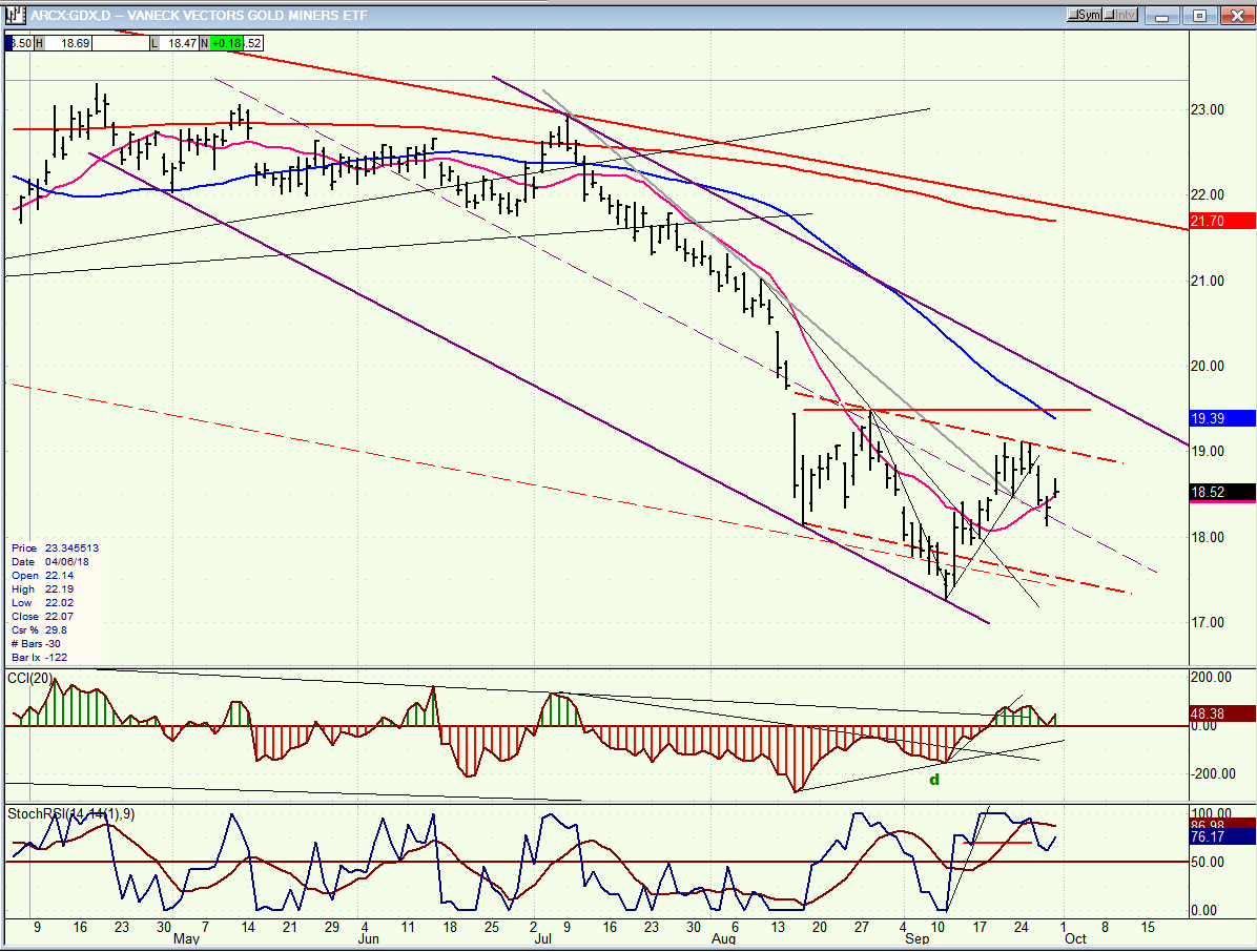 GDX is behaving pretty much as expected and appears to be working on the base necessary to extend its recovery from the low. There is a possibility that it may be forming that base in the form of an inverted H&S pattern. I will wait for a little more confirmation before I label it as such. In any case, it may continue its correction all the way down to the parallel dashed line before reversing.