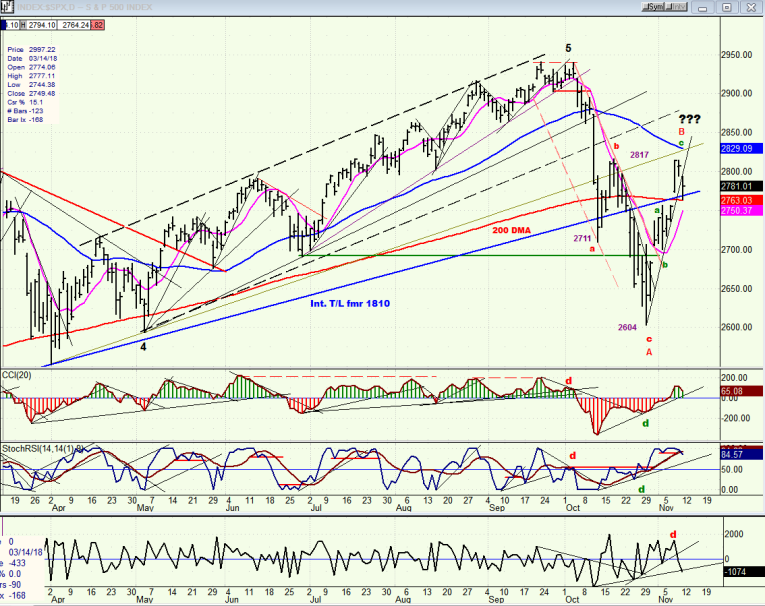 The rally from 2604 is deemed to be a countertrend rally, or a secondary reaction to the primary trend which is now down. As of a week ago Friday, the countertrend had rallied to 2750 and was in the process of pulling back before moving higher. The pull-back was curtailed by the elections, only retracing .382 to 2700, and SPX then surged to our next target of 2815 for a .618 retracement of the entire downtrend from 2841 to 2604. 2815 was reached on Wednesday and SPX has been pulling back, since.