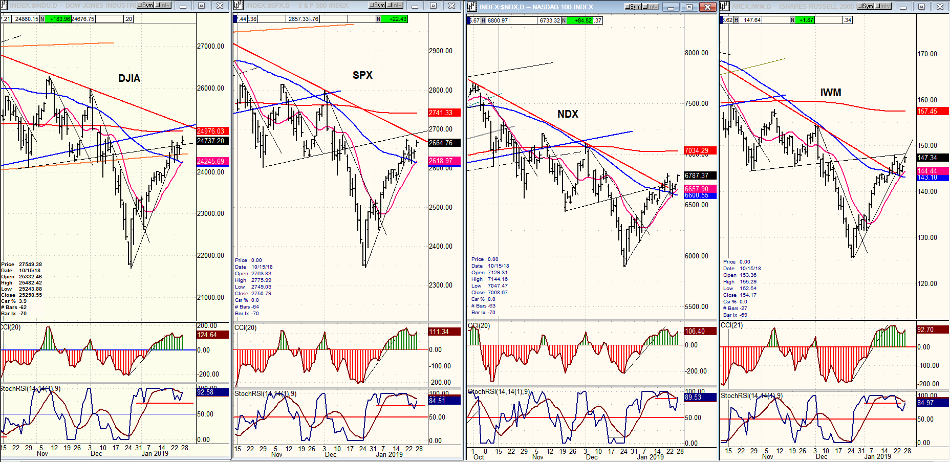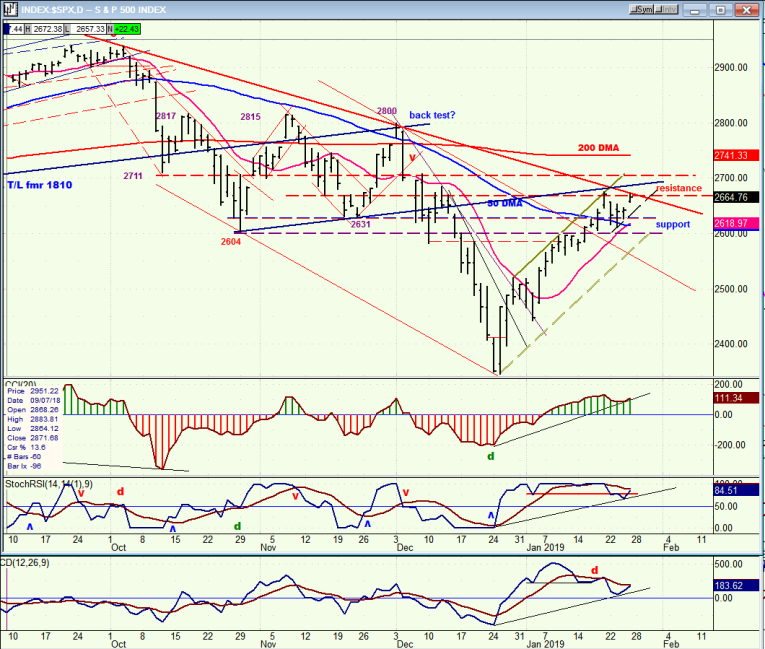 Until last week, the index had formed a wedge pattern. The trend line was broken on Tuesday, but the correction was shallow and, after a couple of days of consolidation, Friday saw a gap opening which neared the previous high but seemed reluctant to overcome it. Any amount of weakness at Monday’s opening would probably create a sell signal at the hourly time frame, but the fact that we have potentially higher projections creates an upside bias. Also, on Wednesday the FOMC statement may show that the Fed is less sanguine about interest rates than it has been and trade talks resume; on Friday we’ll have the jobs report and the government is now re-opened -- if only for three weeks with certainty. Overall, the news background next week may favor the bulls.
