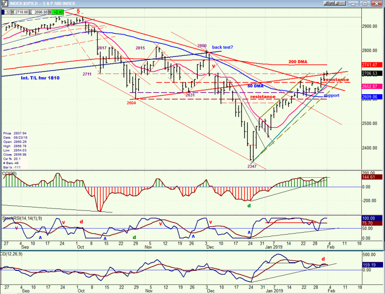 We can categorize the decline from 2941 to 2346 as having taken place in two phases, with the first ending at 2682 and the second one starting from 2800 and concluding at 2346. The rally from the low was initially labeled as a countertrend rally with two potential basic objectives: the first to 2625, and the second to 2714. The first was reached on 1/15 and, without skipping a beat, the index immediately proceeded to the next target which was filled on Friday when the high of the day printed 2716.66 before prices stalled. This is probably as far as the countertrend should be allowed to go. Beyond this level would technically put us back into an uptrend with the good possibility of making a new all-time high.