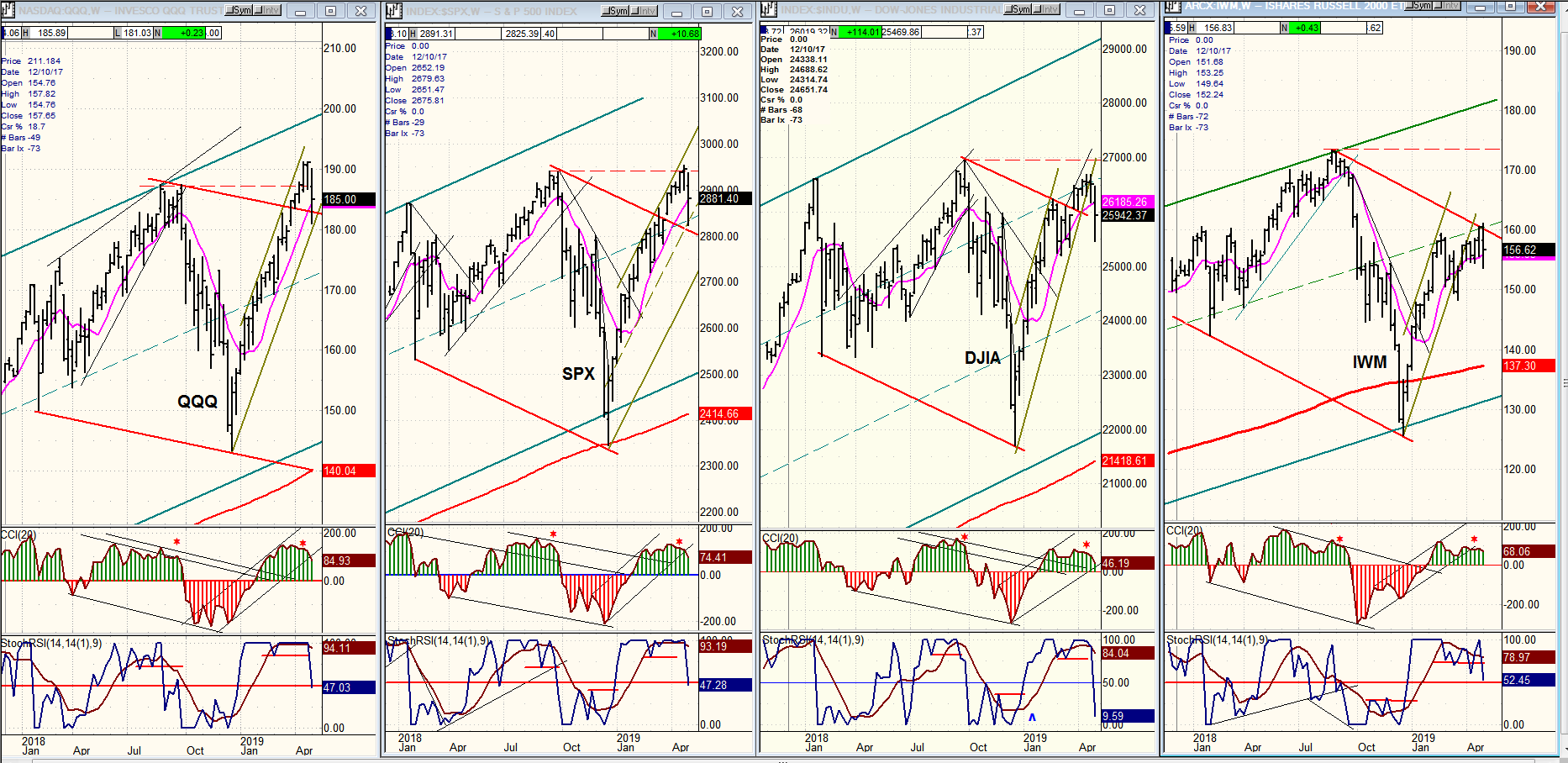 The green lines represent the long-term channel lines from 2009. None of the indexes made it to the top channel line before reversing, but we are a long way from being able to say that the long-term trend (bull market) has ended. We have not even yet conclusively broken outside of the intermediate channel of the QQQ and SPX. (Incidentally, note how different the SPX channel is on the weekly chart than on the daily chart. It is much wider!)