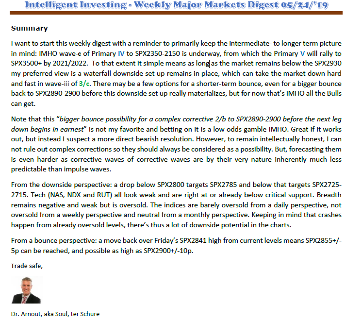 There is a strong probability that the counter-trend rally which started at 2346 on 12/26/18 came to an end at 2954 on 5/01/19. I say “probable” because the weekly indicators, which are the best gauge of intermediate market trends, have only given an initial, unconfirmed sell signal. There are many ways to determine if an index has reversed its intermediate trend, and one of the simplest ways to do this is by looking to see if, on a weekly basis, the index price has closed below its 50-wk MA (or below its 200-dma).