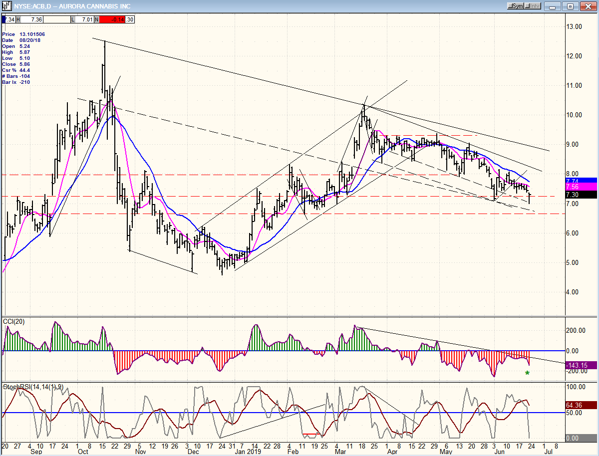ACB continues to correct with the rest of the stocks in the group, but since ACB is one of the industry’s leaders, it is becoming more of a bargain every week. The top oscillator is showing some positive divergence, so we need to keep an eye on the stock to see if this suggests that it is close to a reversal.