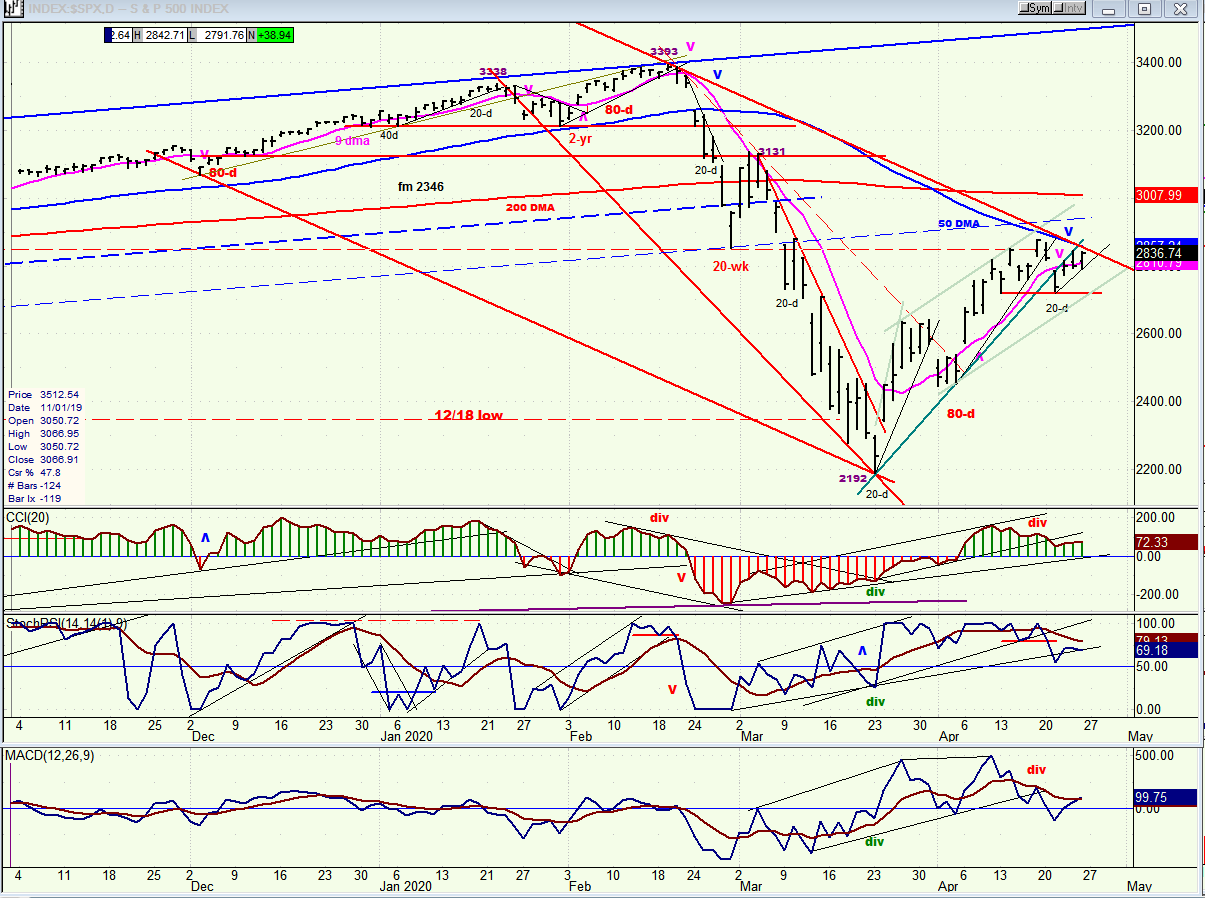 The 2721 level is a very important level because all the trading which has taken place above it is likely to be distribution that, on the P&F chart, has the appearance of being a substantial top with a count already capable of taking the market to a new low. Frankly, after the initial low of 2192, I had not expected a bear market rally of this magnitude; but it gives the bulls who have remained invested a second chance to liquidate their positions before the next phase of the bear market gets underway. The damage which COVID-19 has already done to the world economy is far greater than that experienced during the “great recession” of 2008-2009. And when, with no economic recovery in sight, the full extent of the damage being done sets in, the stock market’s reaction could be even more severe than it has been, so far. At the very least, another substantial decline should take place into mid-year -- an important cycle bottom which could create a market low of intermediate proportion.