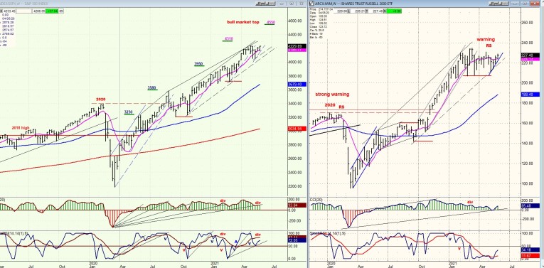 It looks as if NDX is already making an important topping formation. When you compare it to the SPX chart above, you can see that the process of deceleration is more advanced, and while SPX challenged its former high last week, NDX ended the week below both former highs. If it does not attract more buyers next week, it could end up reversing and starting a downtrend ahead of SPX. The process of deceleration in NDX has been evident for some time. It started in the Fall of last year and has increased significantly since the beginning of the year.