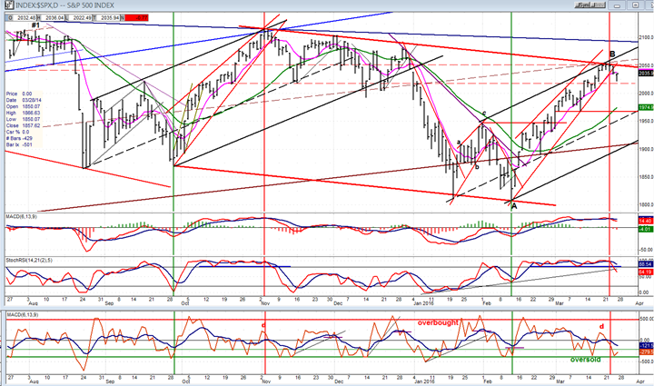 As I stated above, there is a good chance that last week we witnessed the high point of the rally from 1810. Why is that? Let’s start with the chart. I have already mentioned the similarity between the rally from the September low and the one from the February low. They are both wedges, a bearish pattern which is well suited for a countertrend rally. They are also about the same length in time, with the current one being a few days longer than the last one. But there is more than similarity between them in the length of each uptrend: within a few pennies, they span exactly 244 points! Because of that, we can draw a channel (heavy red lines) which contains the present correction and runs at a slightly lesser angle than the top trend line. This is important 1) because it indicates deceleration within the longer-term trend, and 2) because if, after a brief consolidation, the rally should extend outside of that channel, it would be the first indication that the large pattern between August ’15 and February ’16 might only have been a consolidation in the long-term uptrend. For this reason, what the index does over the next few weeks will be very important.
