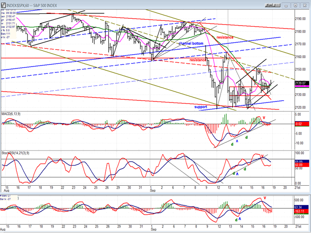 The points of contact of the parallels which form the channels, as well as support and resistance lines are easier to see on this chart. For instance, we can see why the first rally from the 2120 low stopped where it did: right on the dashed blue parallel. On Thursday, SPX broke its first minor downtrend line and found resistance on the dashed parallel of the green channel which caused it to retrace. On Friday, it back -tested the broken minor trend line where it found support and bounced. The key to market direction will come over the next few days. Will the index continue to move up, or will it retrace one more time? And if it does, will the 2120 level hold once again?