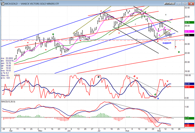 GDX is hanging for dear life just above its former correction low. A daily close below the red line (which was tested on Friday and held) would then challenge that low and lead to another down-draft that could reach about 23.00.