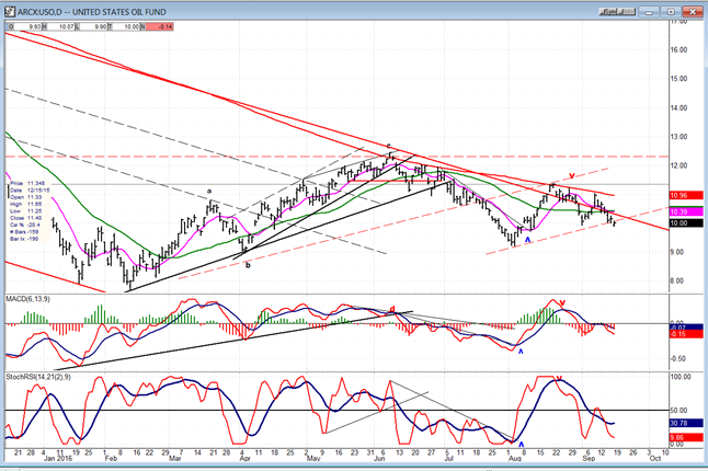 UUP continues to struggle with the overhead resistance which hovers directly above in the form of a channel line and the 200-day MA. Even if it were to overcome these soon, as is implied by the bottoming oscillators, the resistance just above 12.00 which stopped its original rebound from a long-term low will be waiting for a chance to repel a second attempt at moving higher.