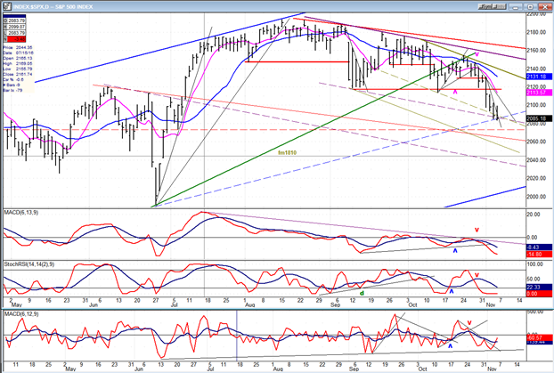 Let’s look at the oscillators! The most interesting one is the A/D oscillator, at the very bottom. It turned up in the middle of the week, even though the index was still dropping. This is normally a very reliable sign that we are approaching the low of the move because it is the early bird the great majority of the time. The next one which usually gives us warning is the SRSI, currently oversold but that has not yet turned up. The MACD, the laggard, is still declining with the barest appearance of deceleration in its red MA. Incidentally, this indicator is not making a pattern of positive divergence, and this could mean that any rally we get over the next few days may not be the one which will reverse the trend conclusively.