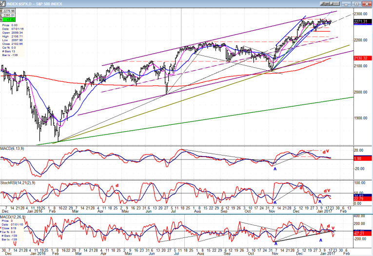 Getting back to the hourly chart, the minor black uptrend line was breached on Thursday, but prices recovered enough on Friday to suggest that the index is getting ready for another small push upward. There is a 15-day cycle due on Monday, and if it turns out to be a high, we could be looking at a decline into the first week of February starting Tuesday -- unless that cycle inverts and becomes a low. If that’s the case, we could still get up to 22,000 and 2300.