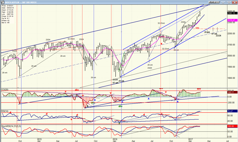 A look at the oscillators tells us that we have every reason to expect a correction. The two lower ones are super overbought, and the CCI is showing negative divergence. Of course, this is not the case with the MACD which is still accelerating upward, but I have found that the CCI is more sensitive and gives earlier warnings. Chances are that the SRSI and MF will have to drop back to the lower part of their range before the correction is finished.