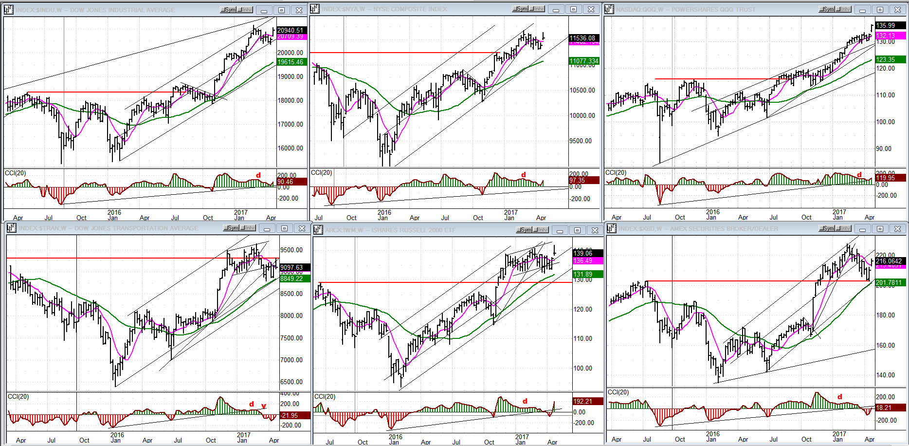As mentioned earlier, the QQQ (top right), which is powered by all the high-flyers, continues to make new highs and left all the others behind, last week. IWM (bottom center) also made a new high last week, but quickly retraced it on Friday, closing its upper gap for good measure. TRAN, (bottom left) still ranks last, rallying to its former long-term high (red line) and quickly pulling back. It is the only one to close the larger gap. This is the one to watch for a long-term trend evaluation of the stock market. It has proven itself capable of advance-warning in the past, and looks ready to do it again.